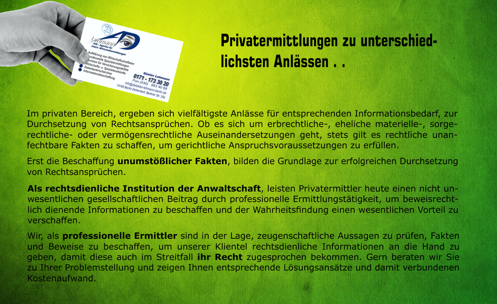 Hierfür stehen wir Ihnen mit über 35 Jahren Erfahrung im Bereich Informationsbeschaffung und kompetenter Sachverhaltsaufklärung gern unterstützend zur Seite.